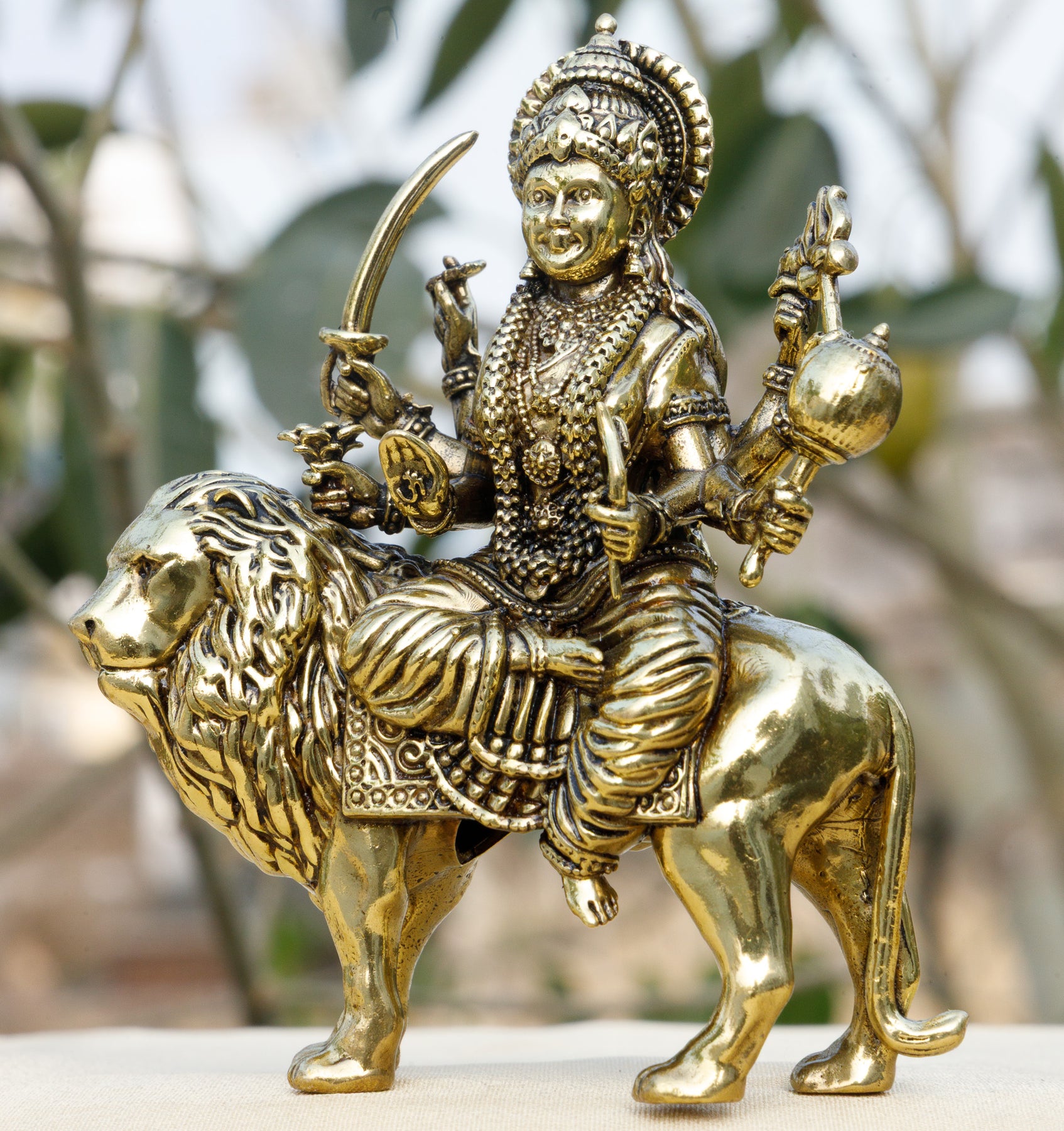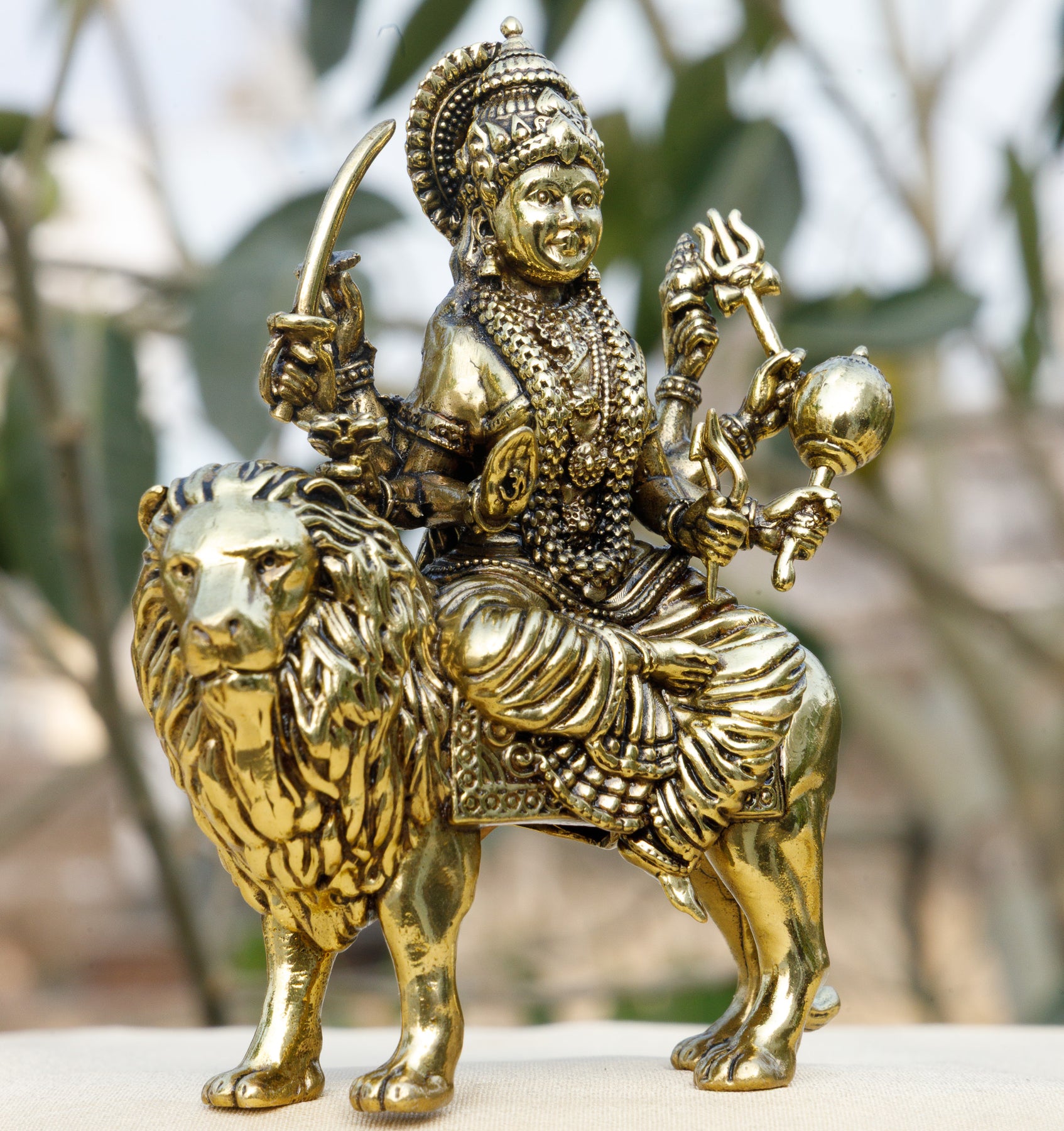 Crafted from 100% pure brass, this 3-inch Durga murti features exceptional detailing — from the fierce yet compassionate facial expression of Maa Durga, her multiple arms holding sacred weapons, to the beautifully sculpted lion mount that represents strength and authority. The rich antique golden finish enhances its spiritual aura, making it a powerful presence despite its compact 3 inch size.